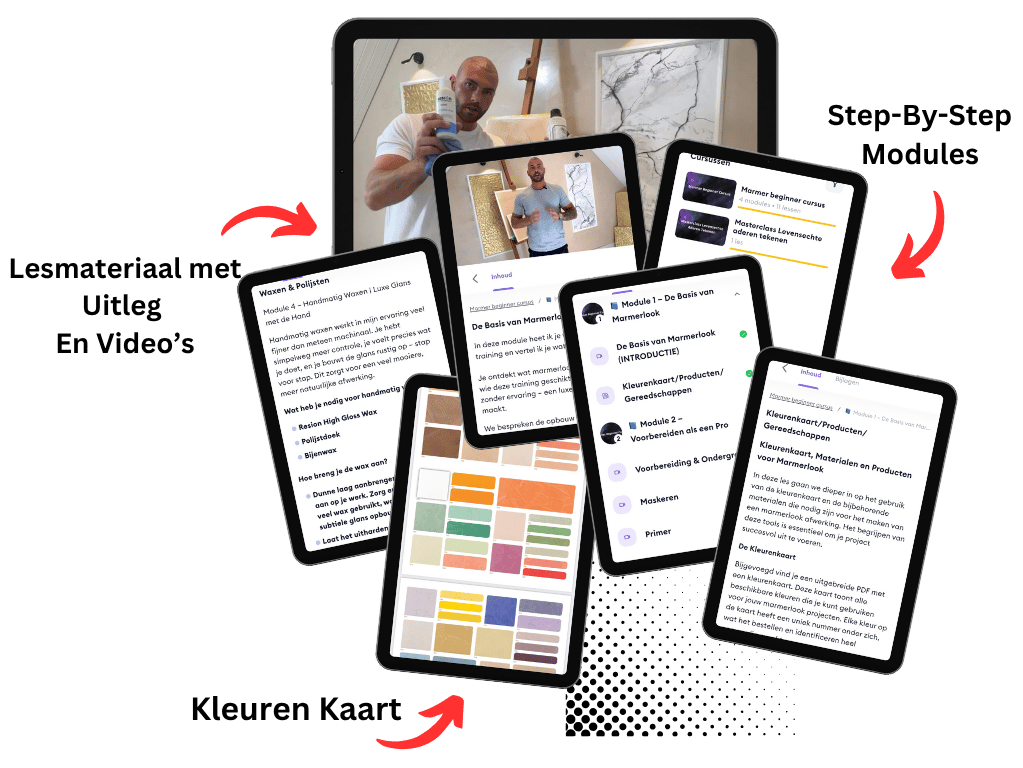 "In deze cursus leer je stap voor stap hoe je zelf een marmerlook creëert, zonder ingewikkelde technieken of dure vakmannen. Je werkt met één kleur en twee lagen, perfect voor beginners. Dankzij duidelijke video's, tips en voorbeelden ontdek jij hoe je luxe wanden maakt die perfect passen bij jouw interieurstijl."